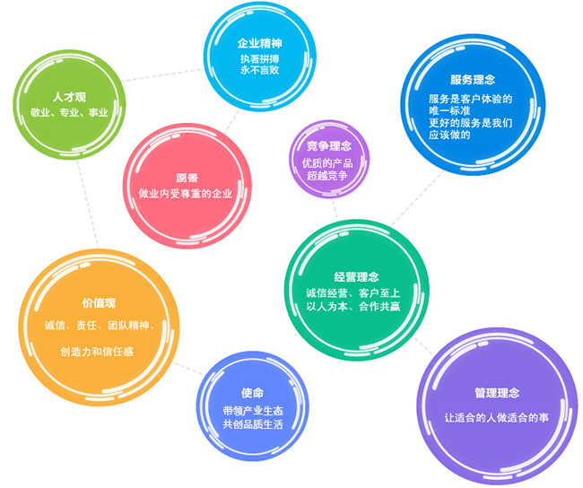 企业宗旨:为顾客创造价值,为企业创造效益,为员工创造前途,为社会创造繁荣。 企业精神:与时俱进,锐意创新,和谐共赢。 经营理念:始于用户所需,终于用户满意;以客户为关注焦点尽量满足客户的期望。 核心价值:优良品质,附加值良好。 质量方针:服务保优良、客户连满意、全员参与、流程控制、持续改进。 服务理念:适应市场需求与创造客户满意
